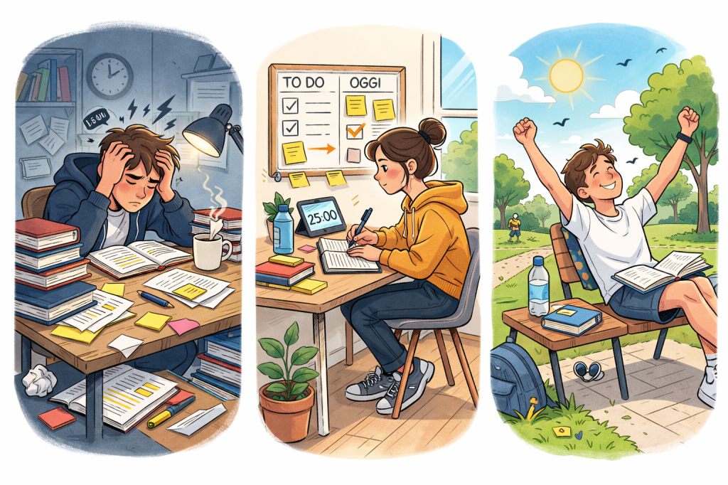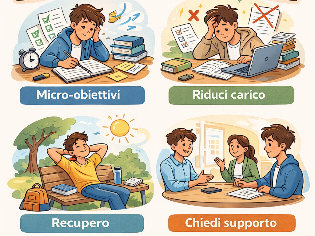 Se sei in burnout, aumentare le ore spesso peggiora la situazione, è più sensato cambiare unità di misura: non pensare a quante ore di studio, ma ai micro-obiettivi che si possono raggiungere, al fine di ricostruire la sensazione di efficacia reale. Quando sei in burnout, continuare solo a leggere o sotolineare ti dà l’illusione di lavorare ma non prepara alla prova (questa discrepanza aumenta ansia e stanchezza). Una strategia utile è introdurre un lavoro che assomiglia alla maturità: